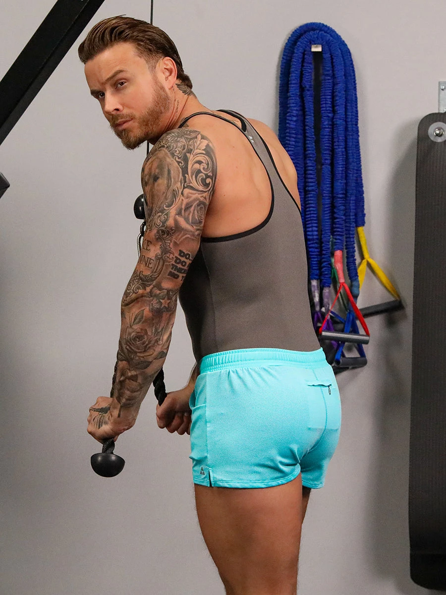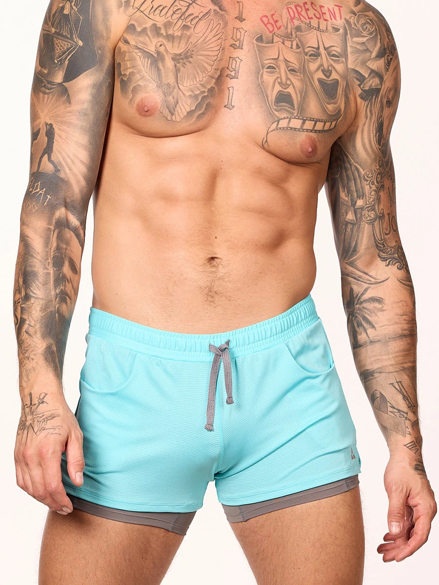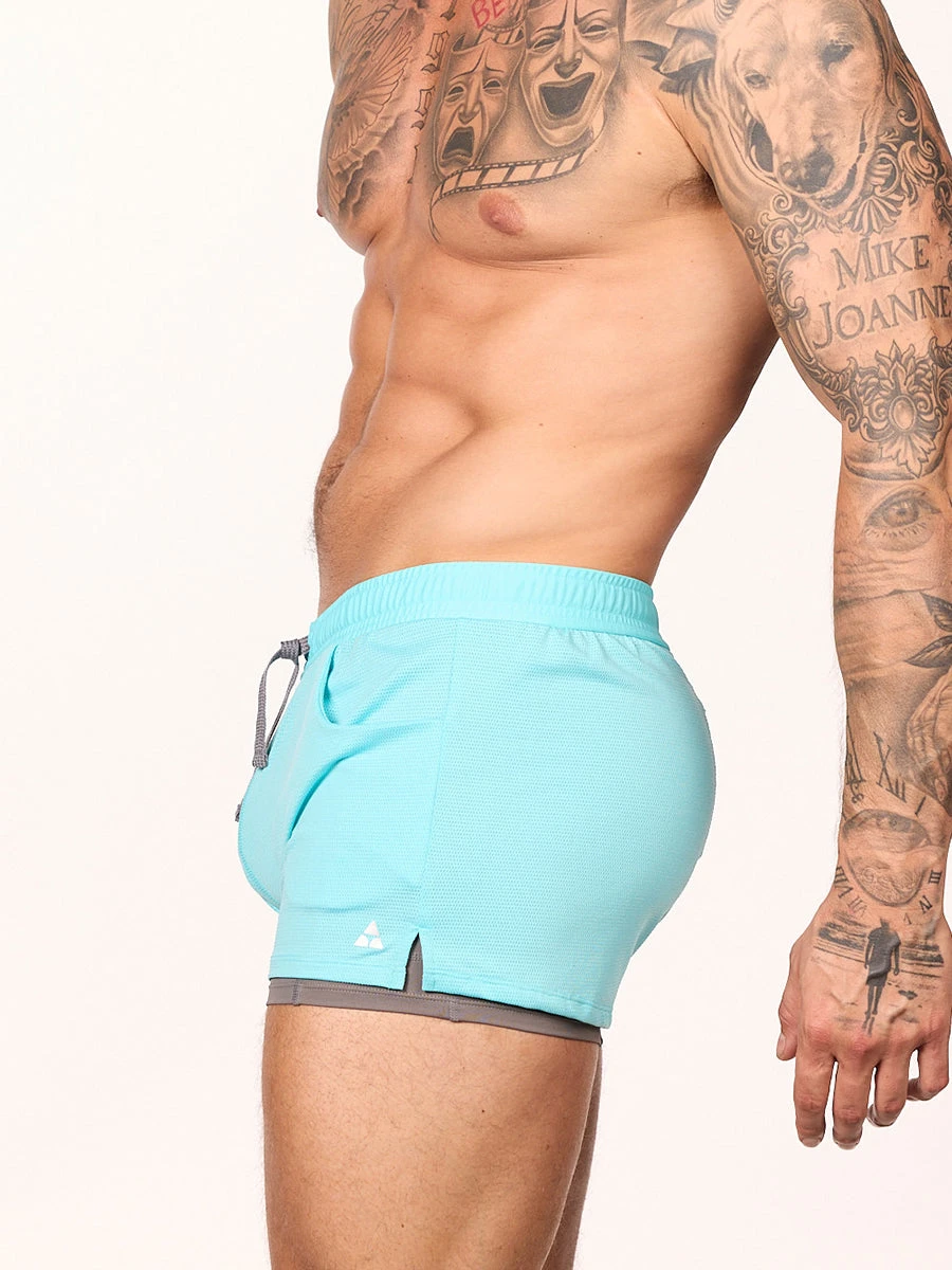 Form meets function with these high performance 2-in-1 Gym Shorts. The outer layer of loose fitting turquoise sports mesh cover the grey compression mini short liner underneath. Two side pockets and a back zipper pocket keep your valuables secure at the gym or on a run. An additional two pockets are included on the interior compression short.