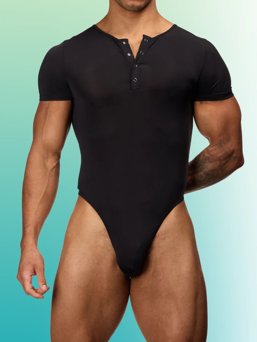 A modern take on a classic style, this men’s bodysuit brings a touch of sporty sophistication to your wardrobe. The henley style neckline with four functional snaps adds a rugged yet refined detail, while the short sleeves and contoured fit hug your body in all the right places. Crafted from a smooth and stretchy black fabric, this bodysuit moves effortlessly with you throughout the day. The brief style back provides comfortable coverage, while the two-snap closure at the bottom makes for easy wearability.