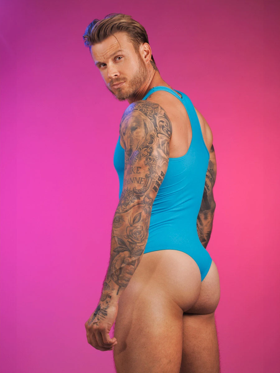 Engineered for a sleek, streamlined fit, this turquoise men’s thong bodysuit delivers both style and performance. The pouch is contoured and features a center seam to provide superior support, comfort, and shape where it matters most. With a snap closure at the base and racerback styling, this bodysuit is sure to add a dynamic edge to your look.