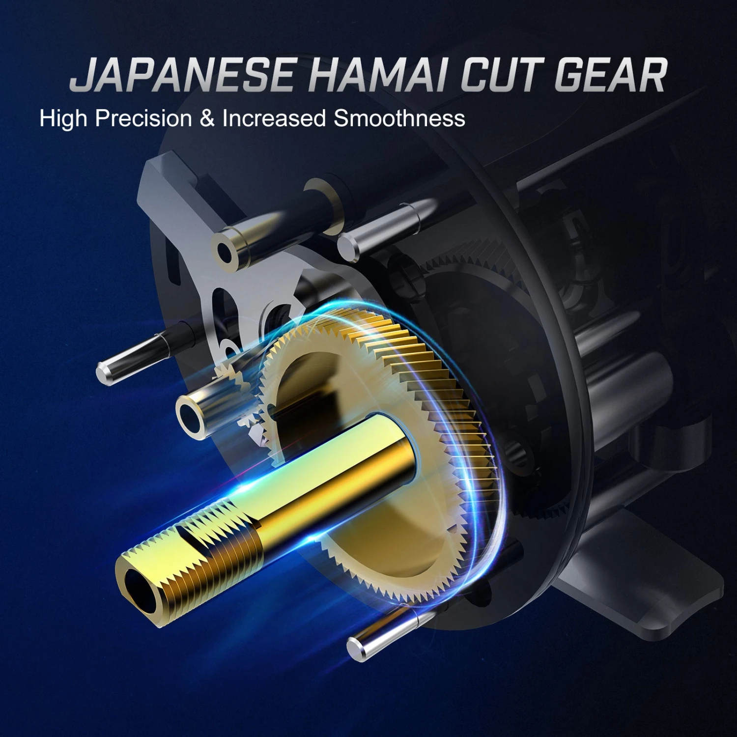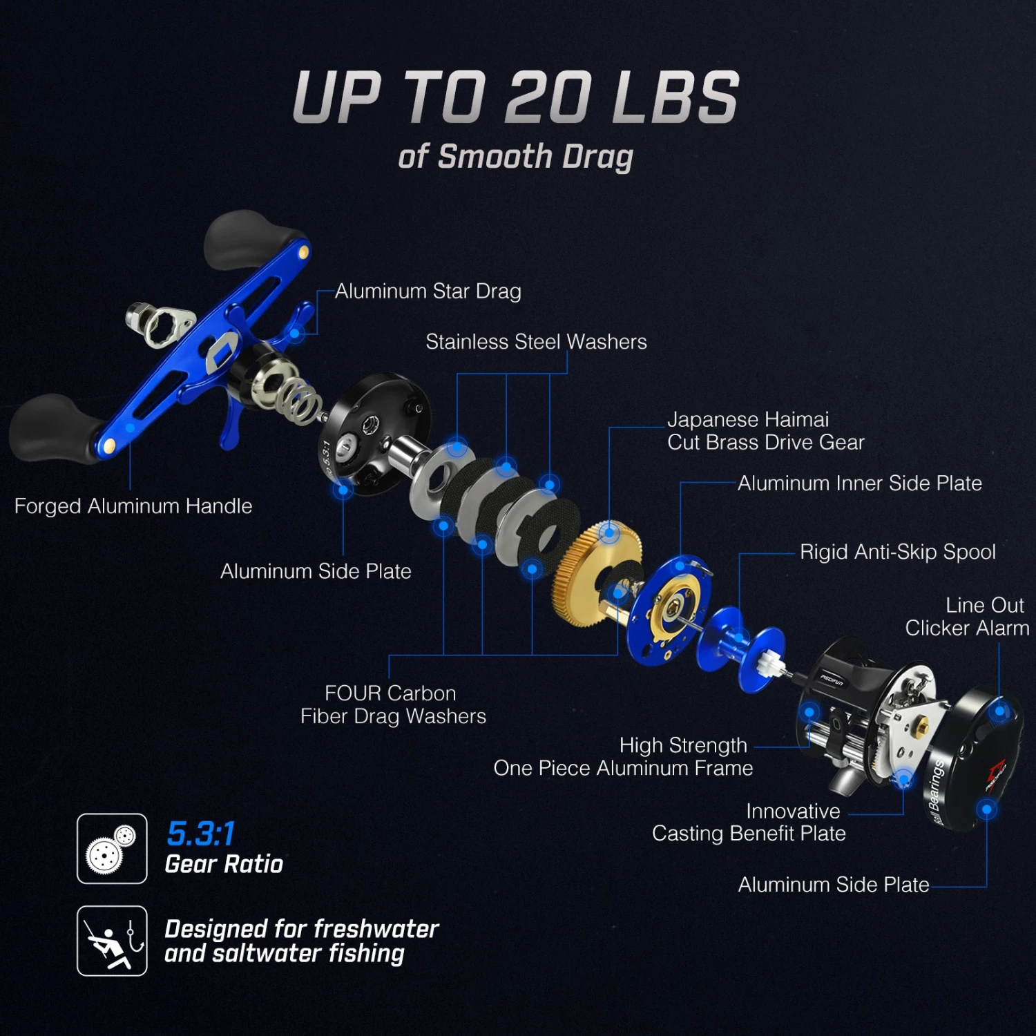 - Powerful – Premium Carbon Fiber Drag System paired with a Japanese Haimai-Cut brass main gear provides up to 22 pounds of stopping power to chase trophy fish
