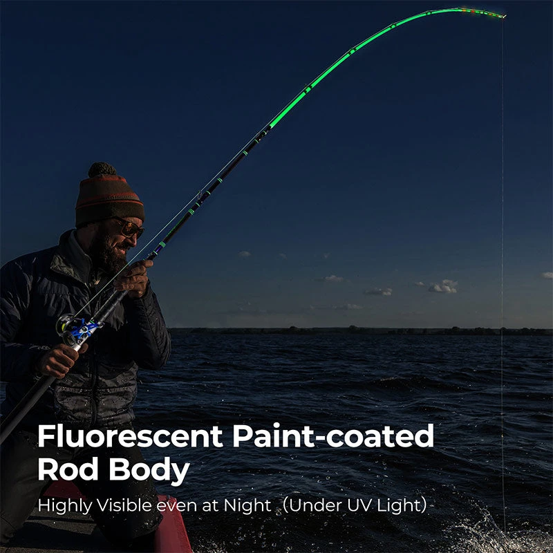 Nighttime Visibility: The entire rod is coated with a special fluorescent paint, making it highly visible under UV light at night. This feature ensures you can easily track your rod’s position, providing an extra layer of convenience and safety during night fishing.