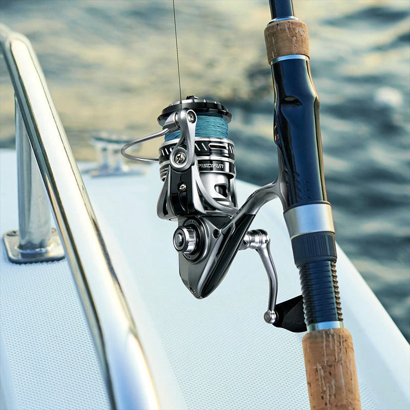 【Premium Gear】The Piscifun NautiX spinning reel utilizes high-strength HRB 90 pinion gears, CNC machined aluminum main gears with a metal oxidation process for greatly improved wear and corrosion resistance; The integrated CNC machined aluminum alloy handle and EVA grip for a firm, non-slip grip and powerful handling.