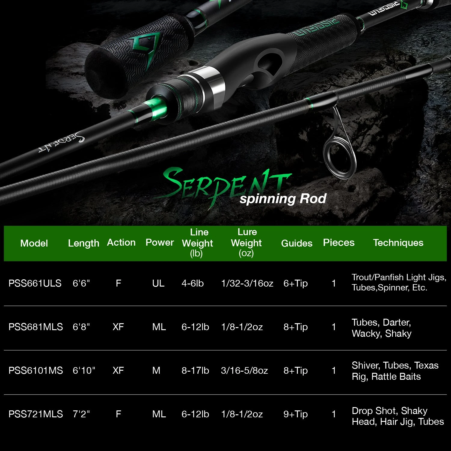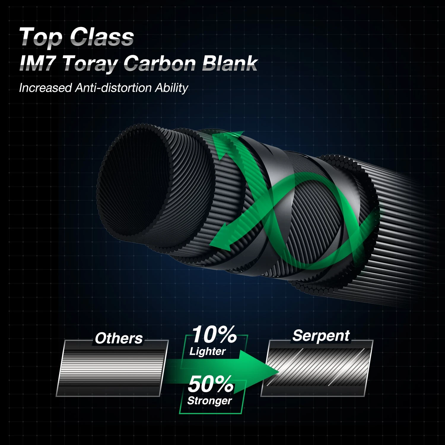 Zero Coating IM7 Carbon Blank – The Serpent Series Spinning fishing rods are constructed with our high-level IM7, zero coating, X-shaped, Japanese Toray Carbon Fiber Blank – which makes the rod 10% lighter and 50% stronger than other rods. When combined these features deliver exceptional sensitivity and incredible power.