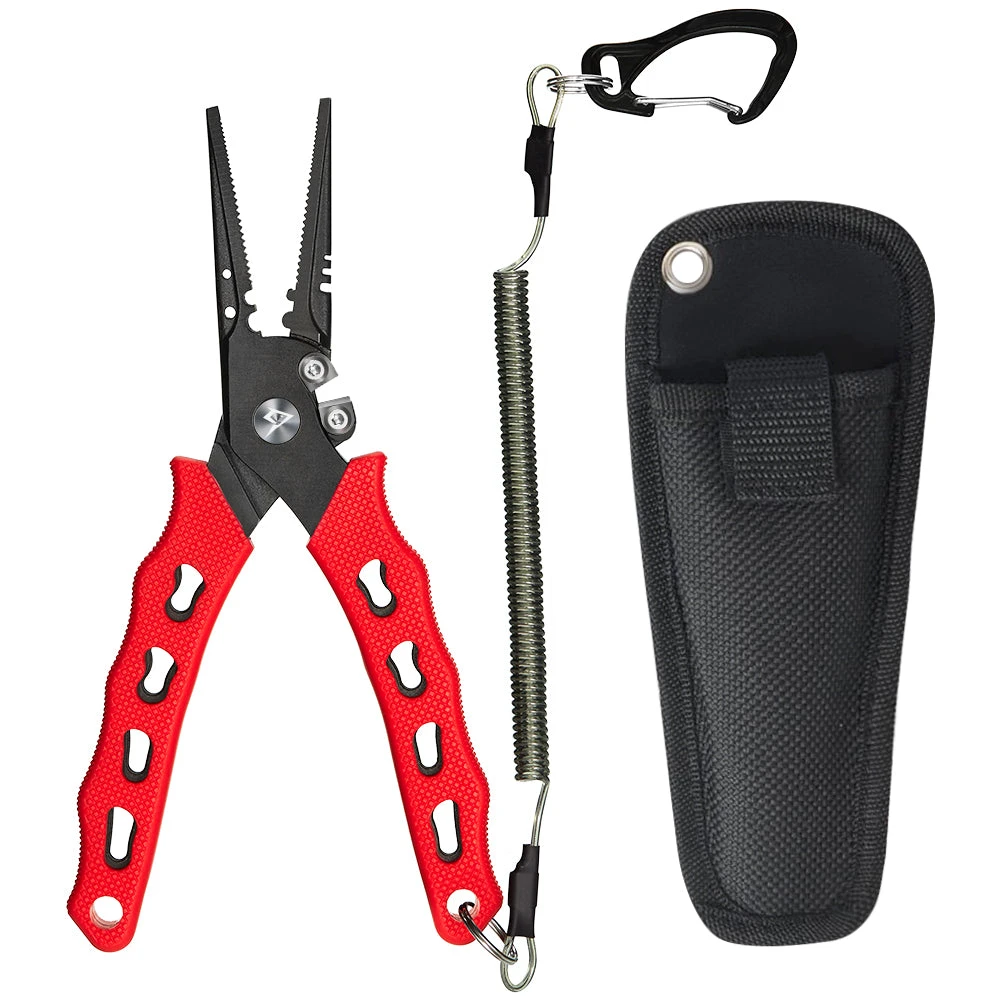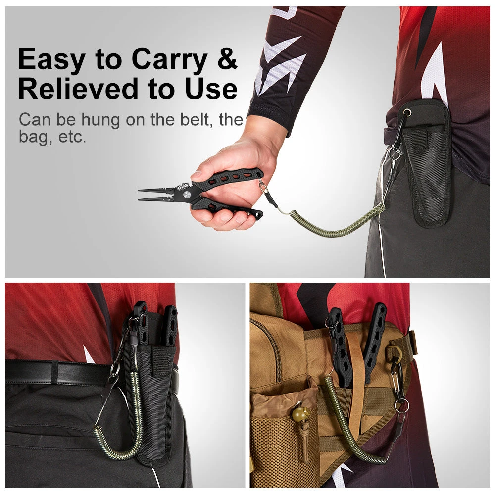 MULTI-FUNCTION JAWS – Can easily grab and remove any hook and also work great to crimp your lead split shot weights. The holes on the jaws can pull the knot connected to the fish hook a bit tighter; And the unique open-loop function on the split ring pliers makes hook removal and replacement a cinch.