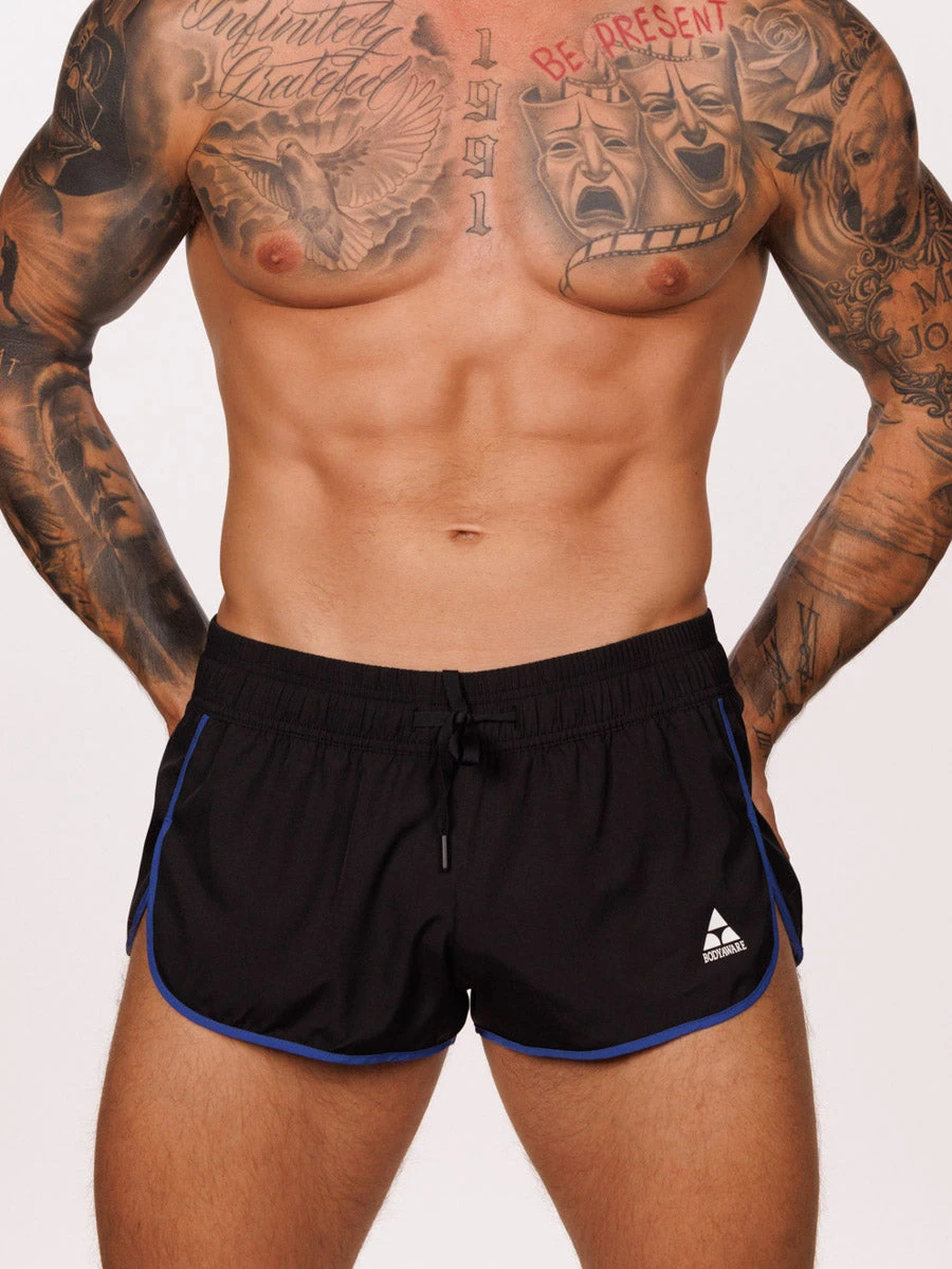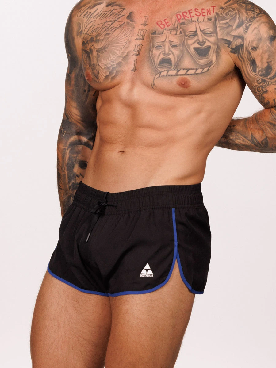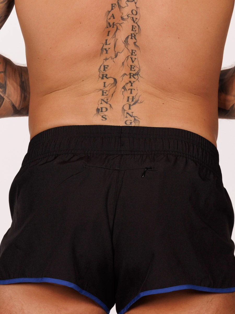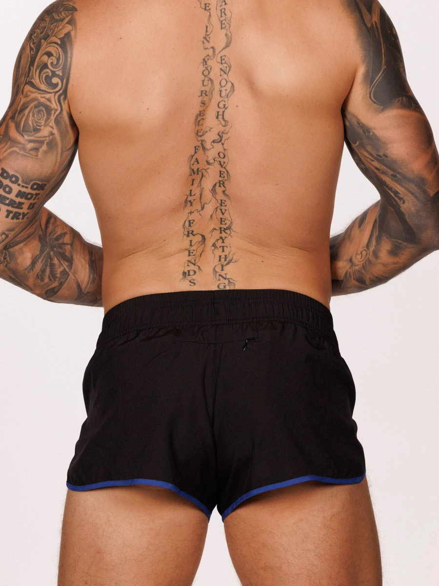 Designed for those with an active lifestyle, these slim-fit split shorts are engineered to combine performance and style. Made from our lightweight black athletic fabric, they give a sleek look accented by contrasting blue trim along the edges. The side splits are engineered to allow for unrestricted movement, while also offering a flattering view of your thighs. A discreet zip pocket at the back center ensures secure storage for your valuables.