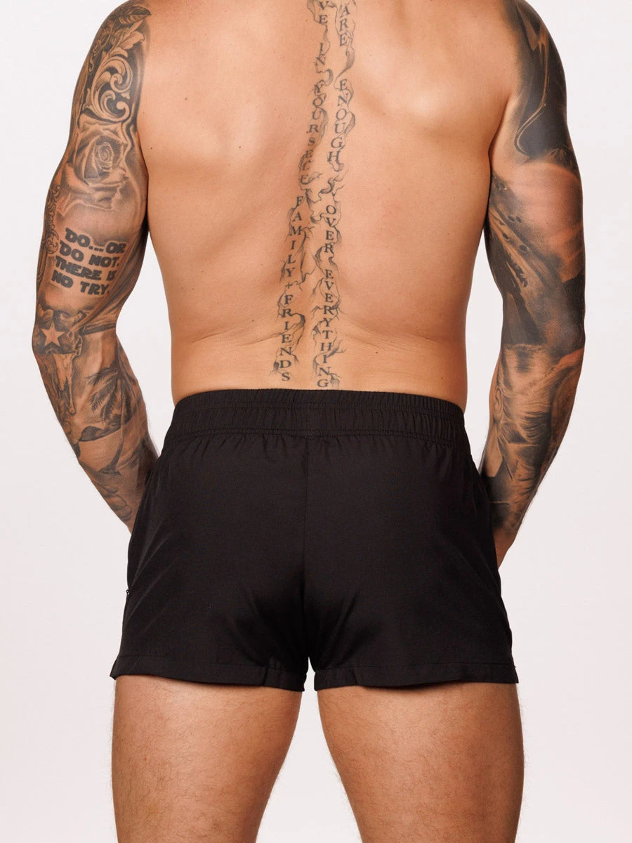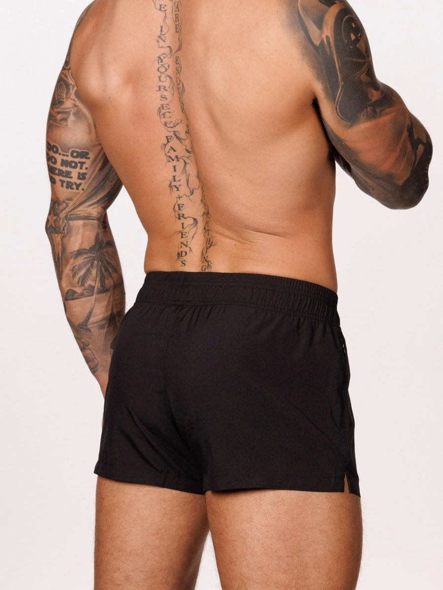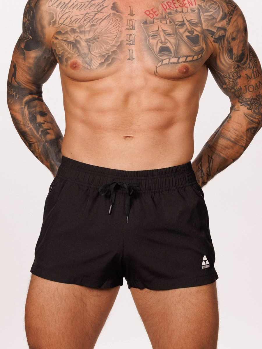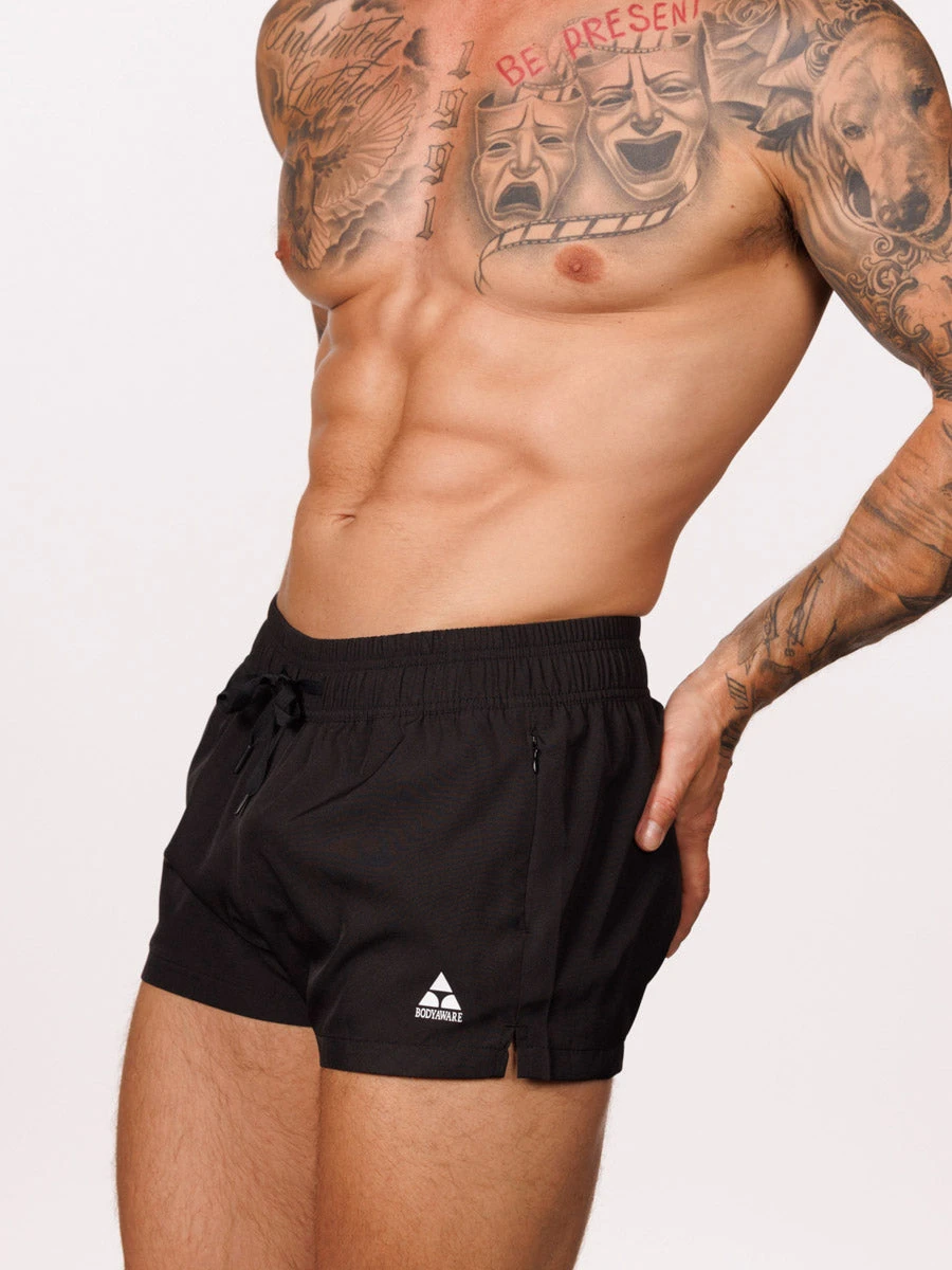 Enhance your exercise routine with these fun athletic shorts. These lightweight black gym shorts are engineered with a sleek, square-cut design that offers both style and functionality. The elasticated waistband, complemented by an adjustable outer drawstring, ensures a secure and customized fit. Features two convenient zippered side pockets.